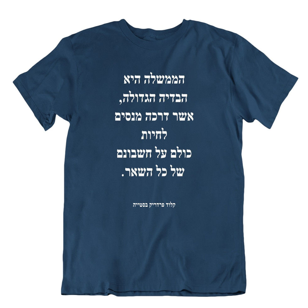 חולצה עם אמירה נחרצת הממשלה היא הבדיה הגדולה, אשר דרכה מנסים לחיות כולם על חשבונם של כל השאר. "קלוד פרדריק בסטייה"